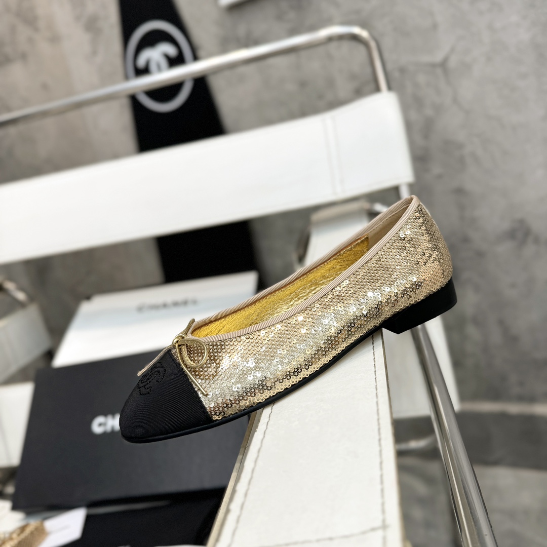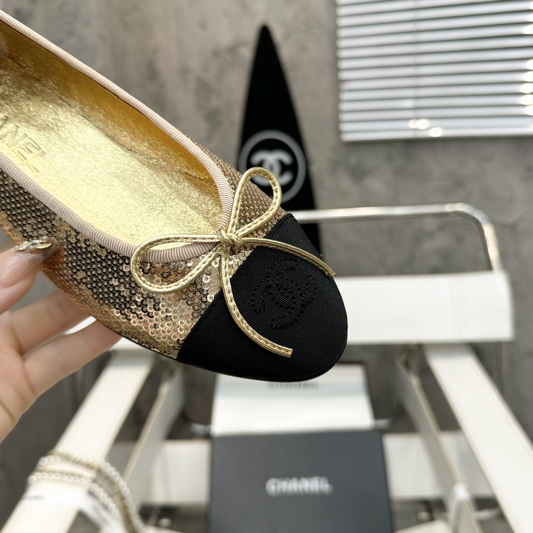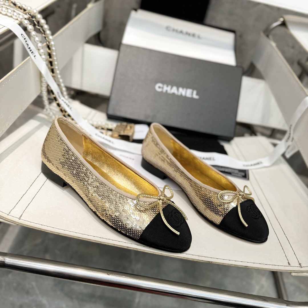 Iconic CHANEL design with gold sequin and black cap-toe detailing, creating a dazzling and sophisticated look. The metallic bow and embroidered logo highlight exquisite craftsmanship, while the low heel ensures comfort for daily wear and elegant events.
