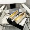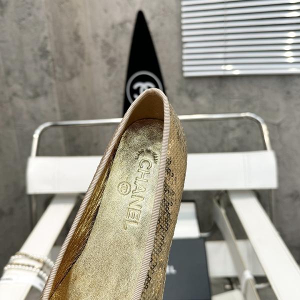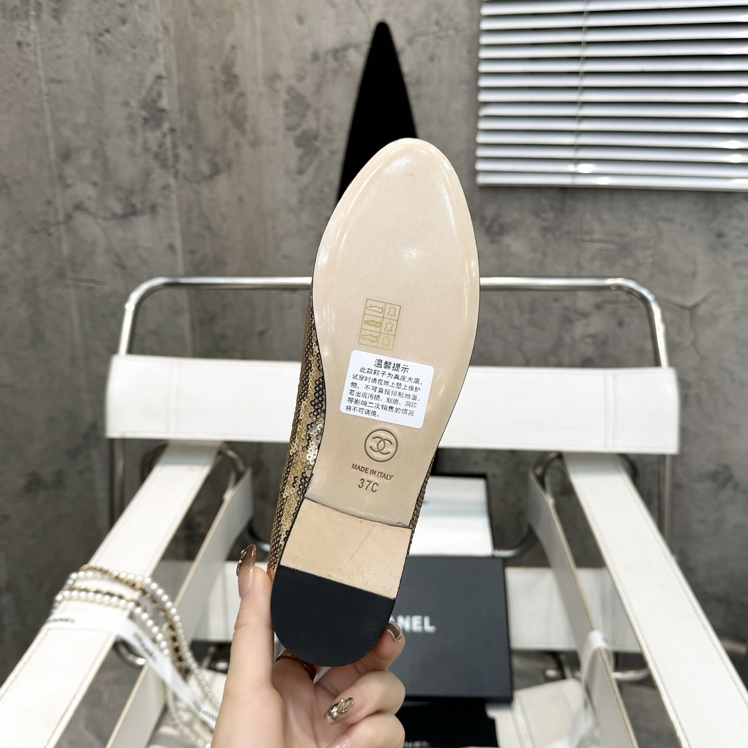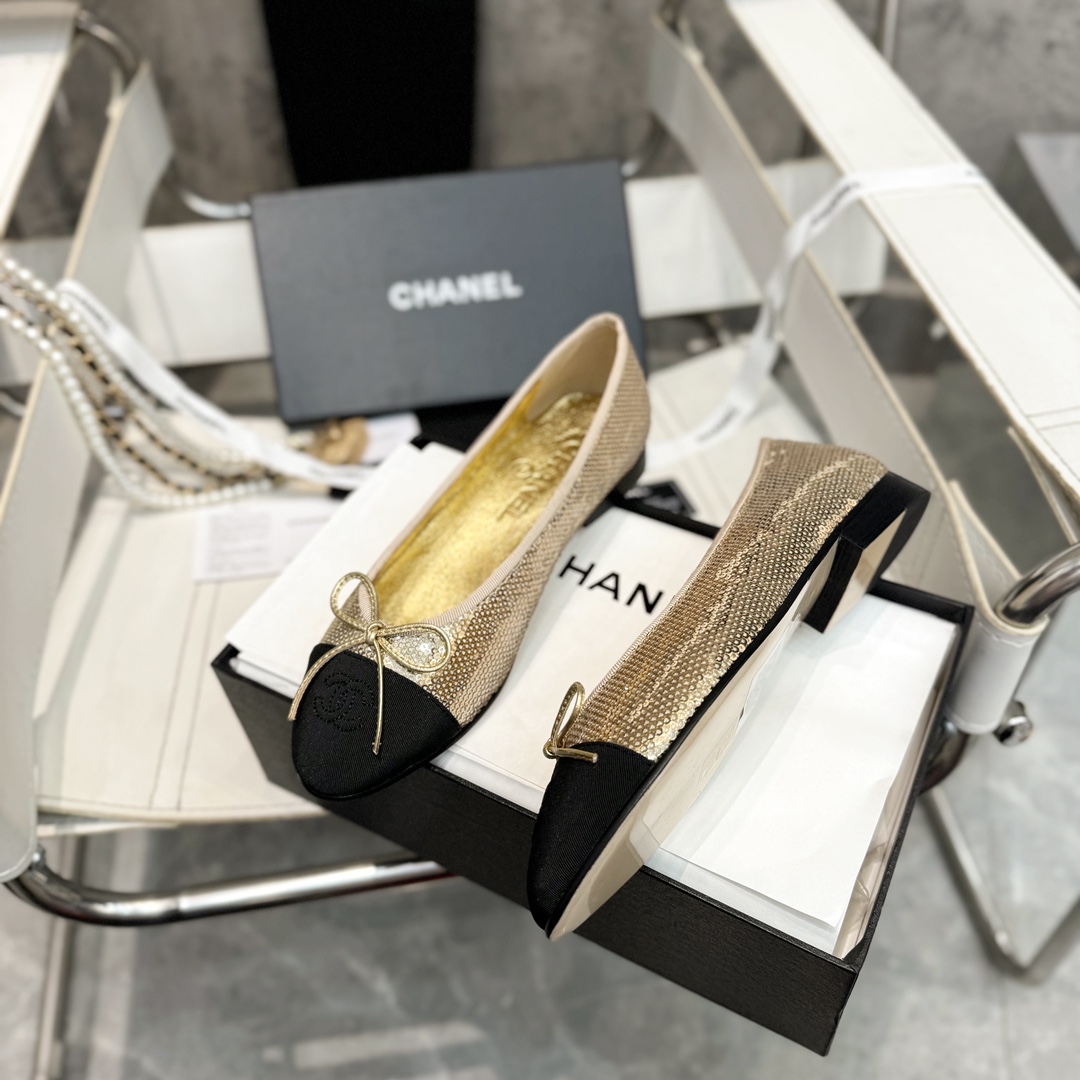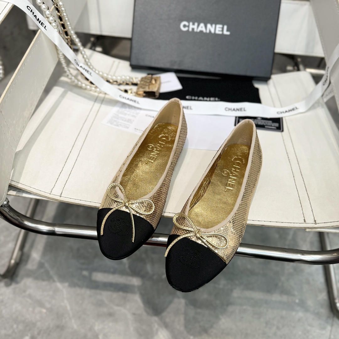 Iconic CHANEL design with gold sequin and black cap-toe detailing, creating a dazzling and sophisticated look. The metallic bow and embroidered logo highlight exquisite craftsmanship, while the low heel ensures comfort for daily wear and elegant events.