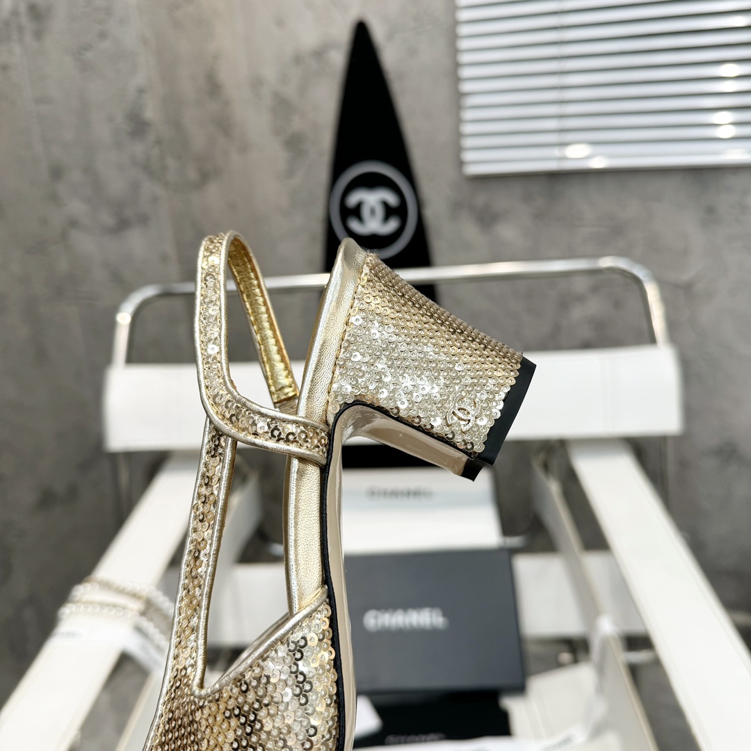 Features a classic two-tone design with luxurious sequin and satin materials. The chunky heel ensures comfort and stability, while the square toe offers timeless style. Guaranteed CHANEL quality with premium materials and a soft, breathable lining, making these sandals perfect for both formal events and everyday wear.
