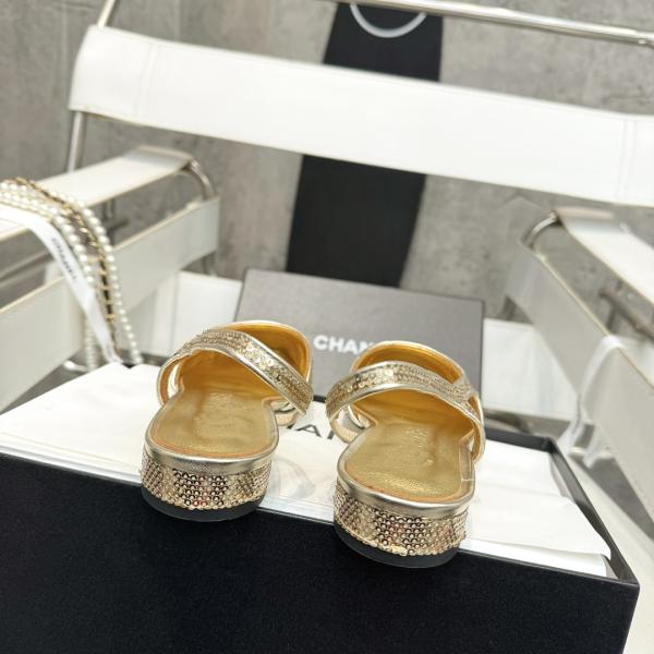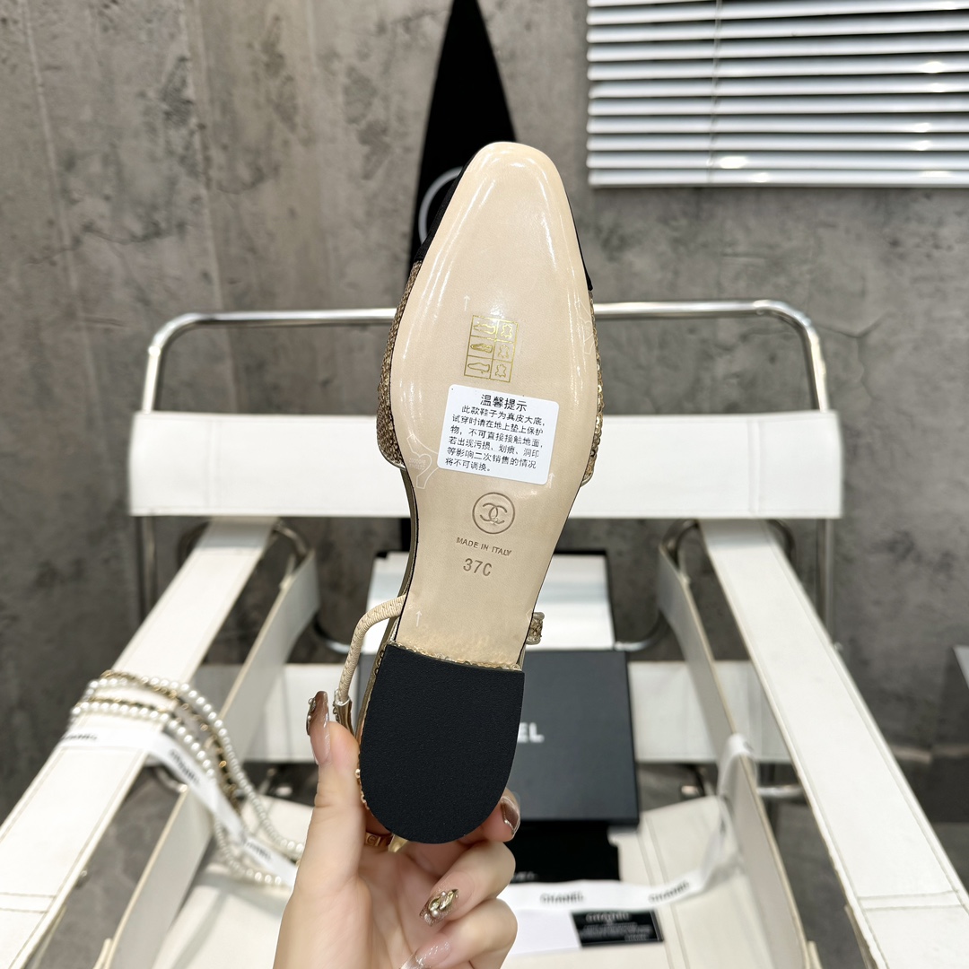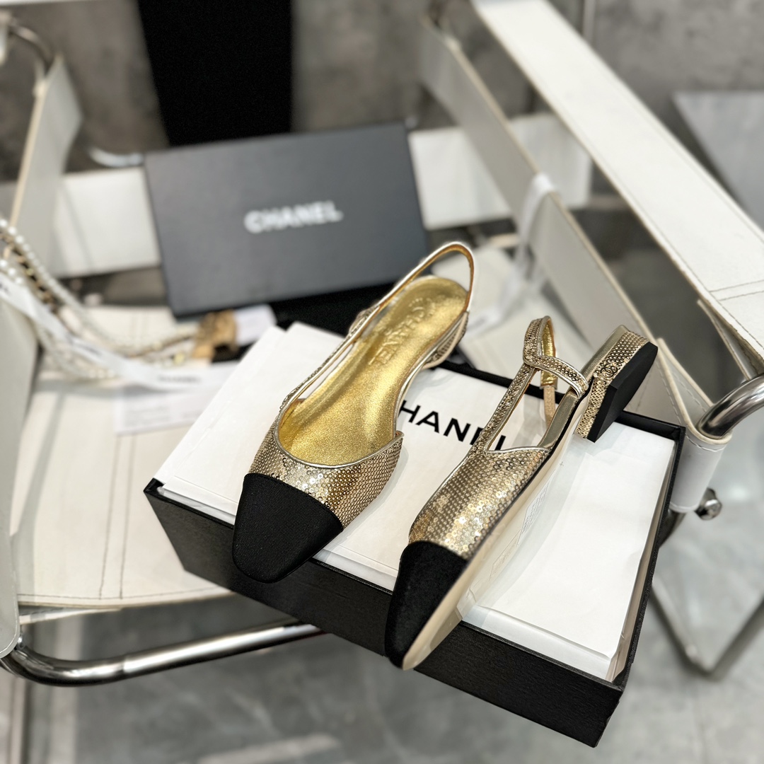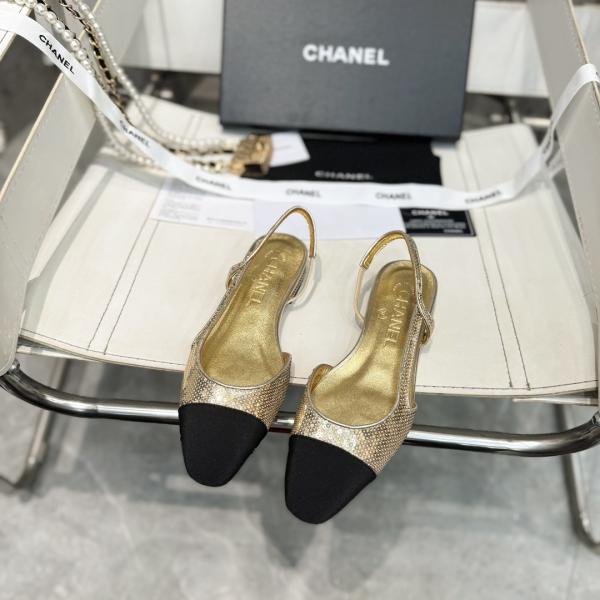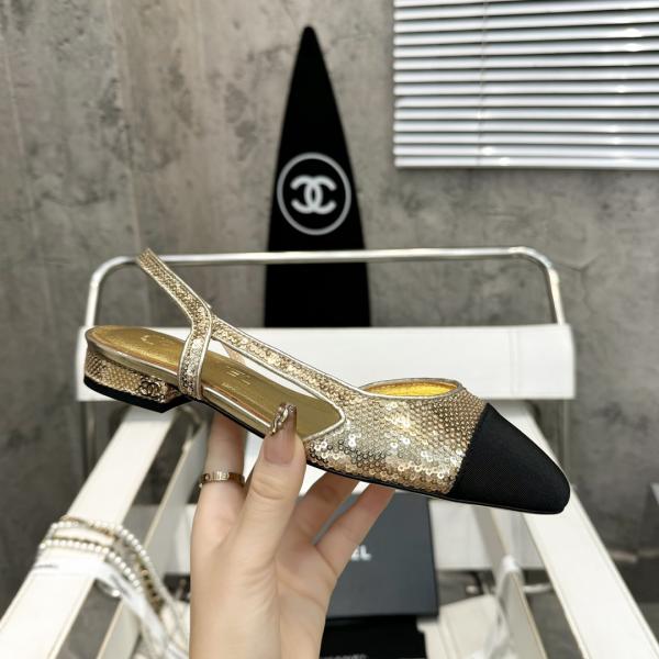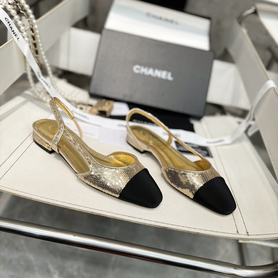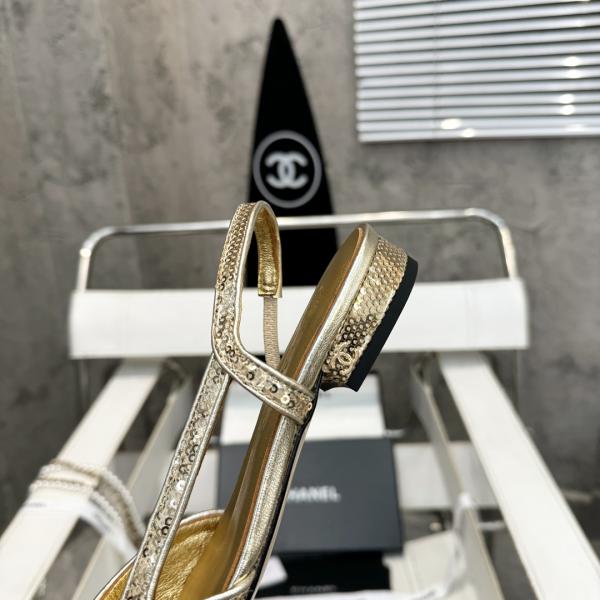 Featuring CHANEL's iconic craftsmanship, these sandals boast a unique gold sequin and black two-tone design that catches the eye. Made with premium imported sheepskin for softness and comfort, they include a stable chunky heel and an open-back for breathability. Versatile for both formal events and everyday wear, they exude timeless elegance and feminine confidence.