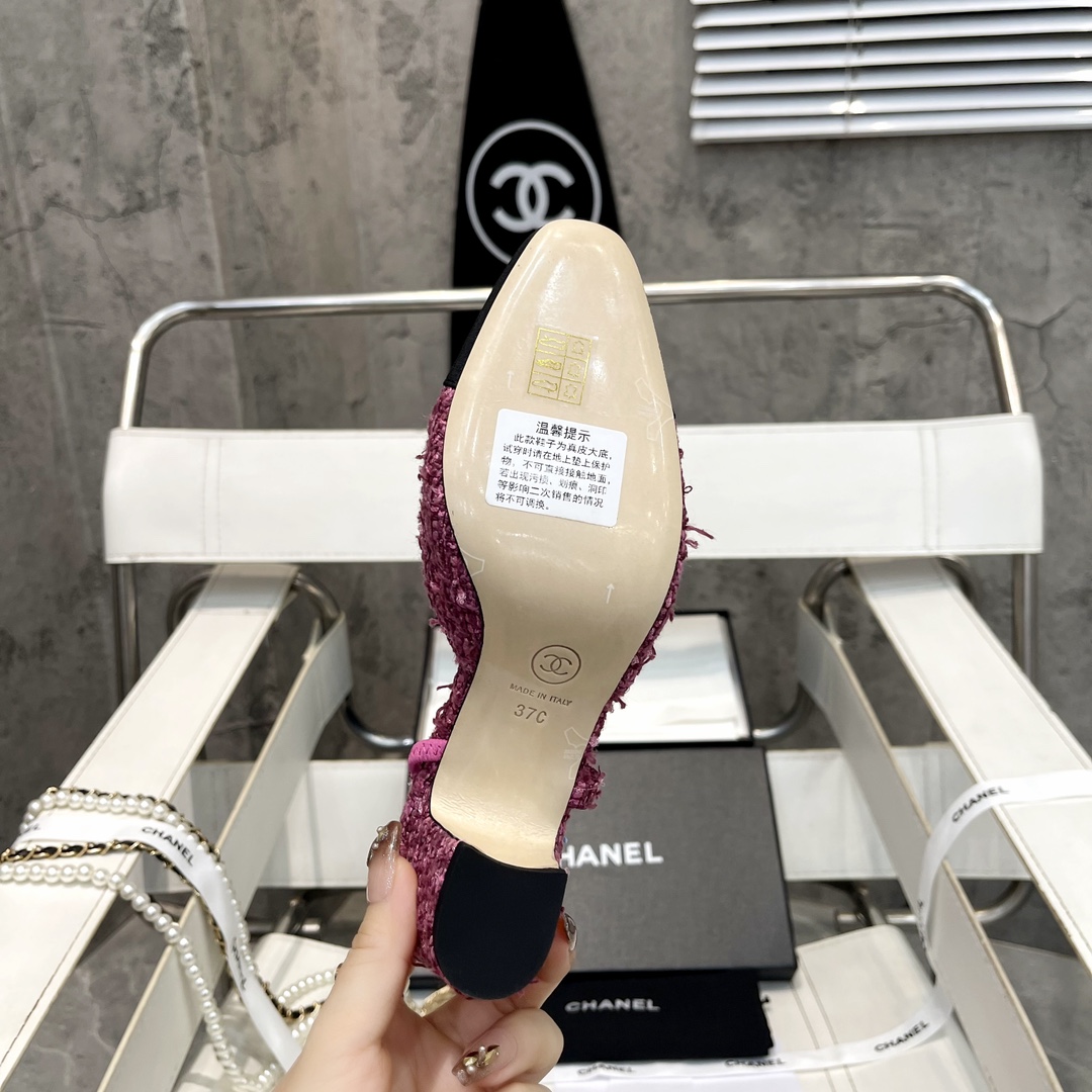 Adorned with the iconic CHANEL double-C emblem, these sandals feature a stylish two-tone design of pink tweed and black satin. The chunky heel ensures stability and comfort, while the square toe adds a fashionable touch. The open back design enhances breathability, and the soft lining provides excellent comfort. Ideal for various occasions, they exude feminine elegance and sophistication.