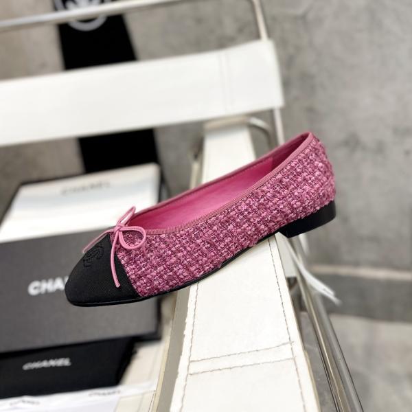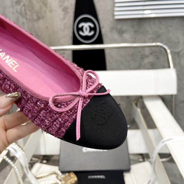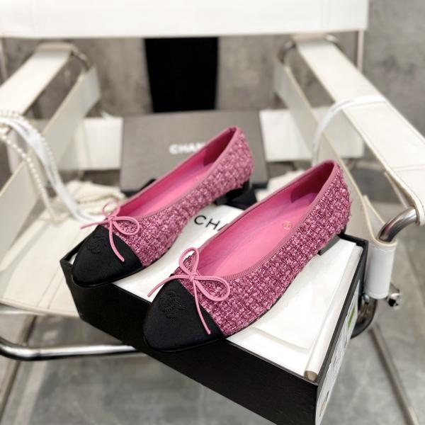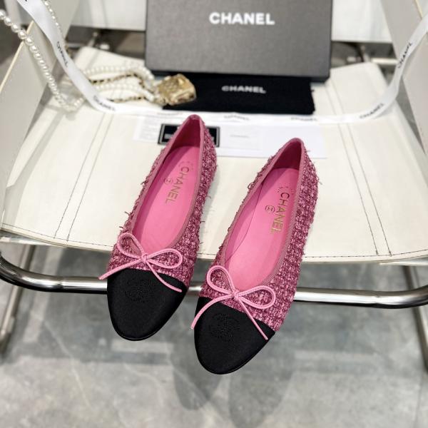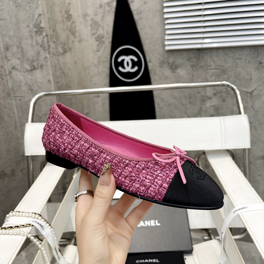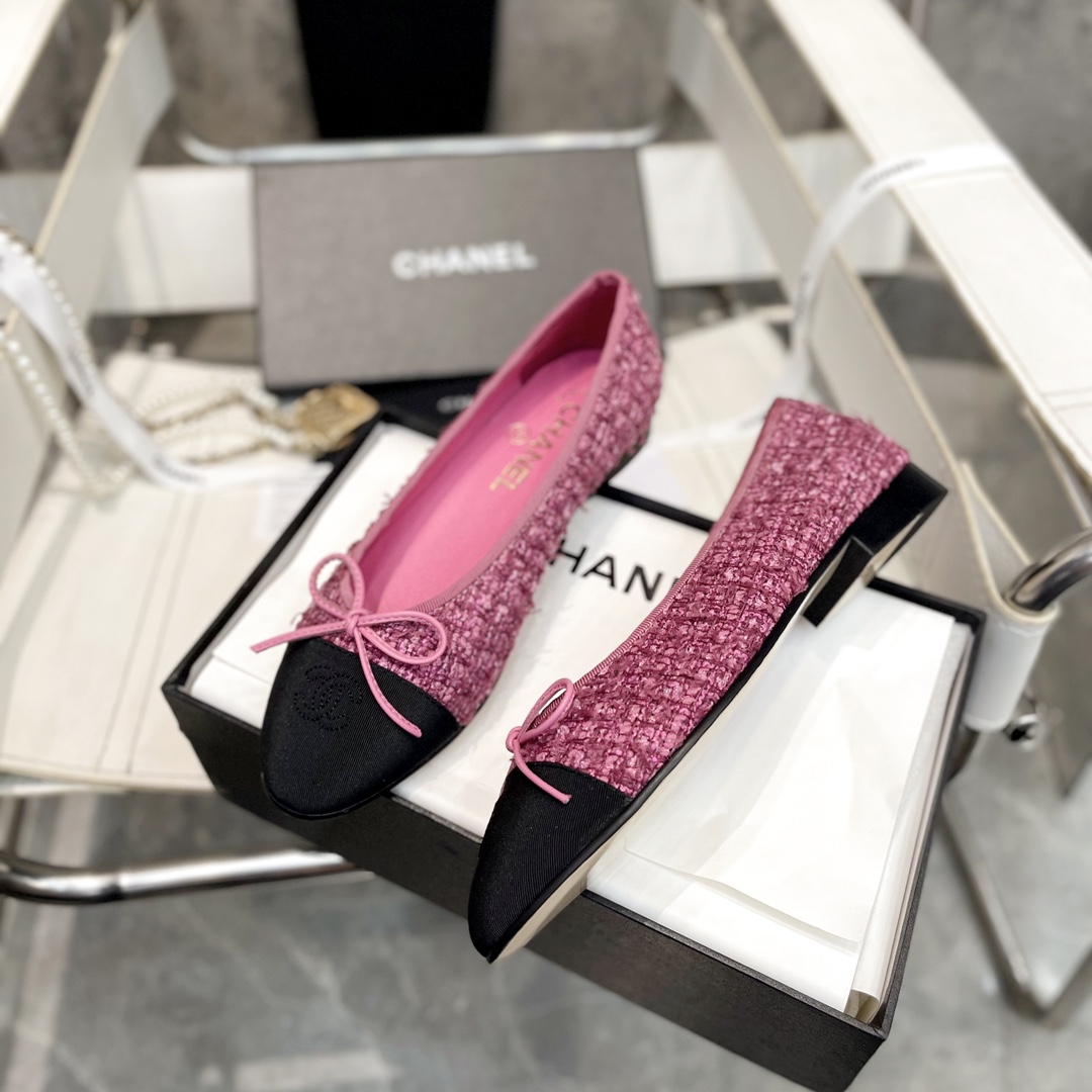 Featuring a classic two-tone design, these flats combine pink tweed with black satin for a luxurious contrast. The toe cap is adorned with the iconic CHANEL embroidery and a delicate bow. The pink leather lining enhances comfort, making them versatile and stylish for any occasion, embodying high-end fashion.