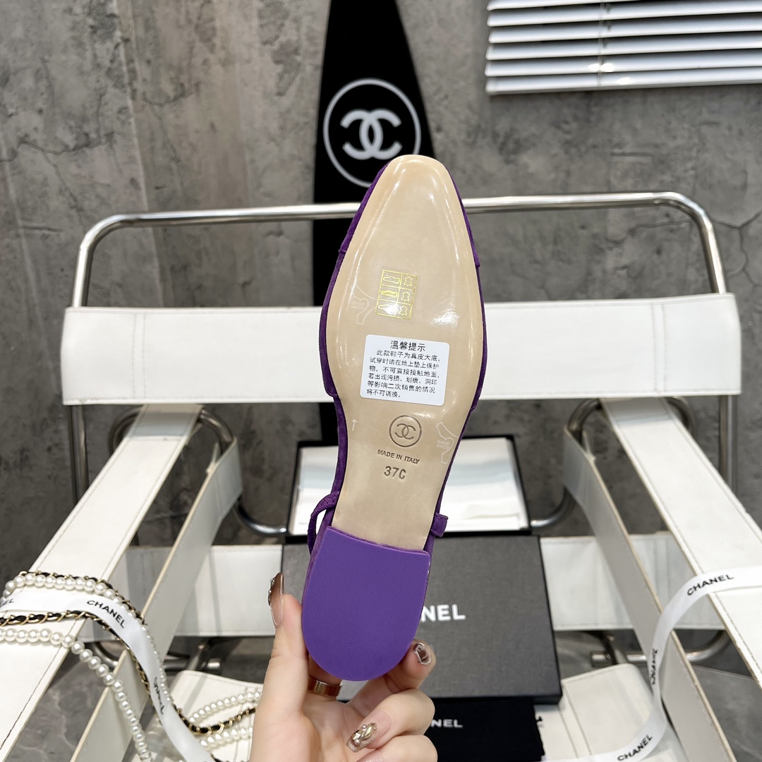 Chanel's iconic design meets luxury with premium purple suede, a chic square toe, and comfortable chunky heel. The secure ankle strap and Italian calfskin lining ensure a perfect fit and breathability. Versatile and elegant, these sandals are a must-have for any fashion-forward woman.