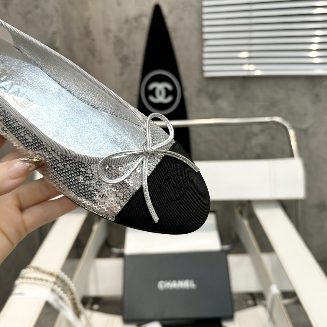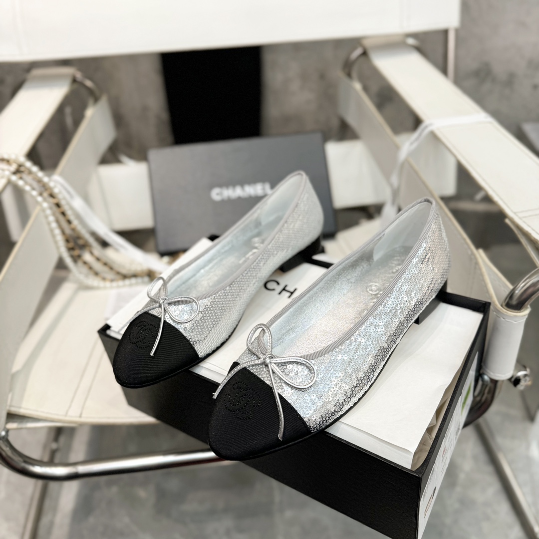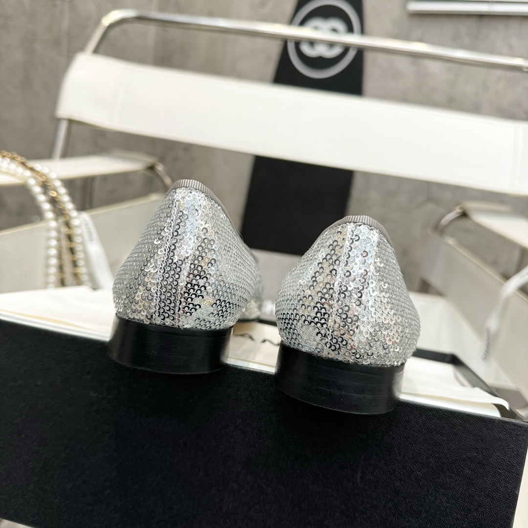 Dazzling silver sequin upper with classic black toe cap for rich visual contrast; elegant bow detail adds sophistication; imported leather sole and sheepskin lining ensure comfort and breathability; low heel design perfect for daily wear and stylish occasions, showcasing luxury quality.
