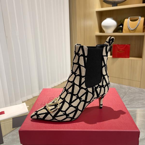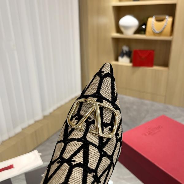 Iconic black and beige grid print offers bold, distinctive style; signature gold-tone V-buckle adds luxurious brand identity; pointed toe and stiletto heel create a sleek, elongated silhouette; stretch side panels and soft lambskin lining ensure comfort and fit; slip-resistant and durable rubber sole provides practicality for daily wear.